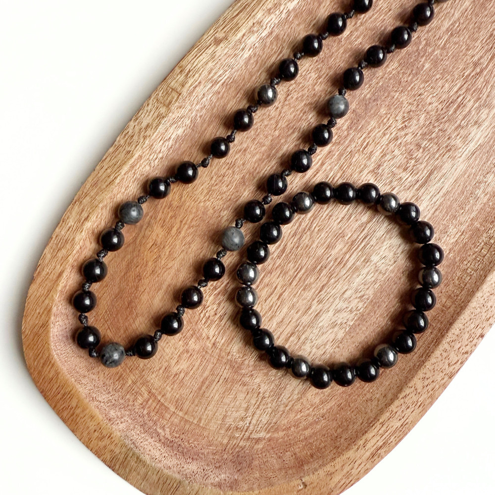 Black Core Szett – ónix, hematit & larvikit férfi szett (karkötő + nyaklánc)