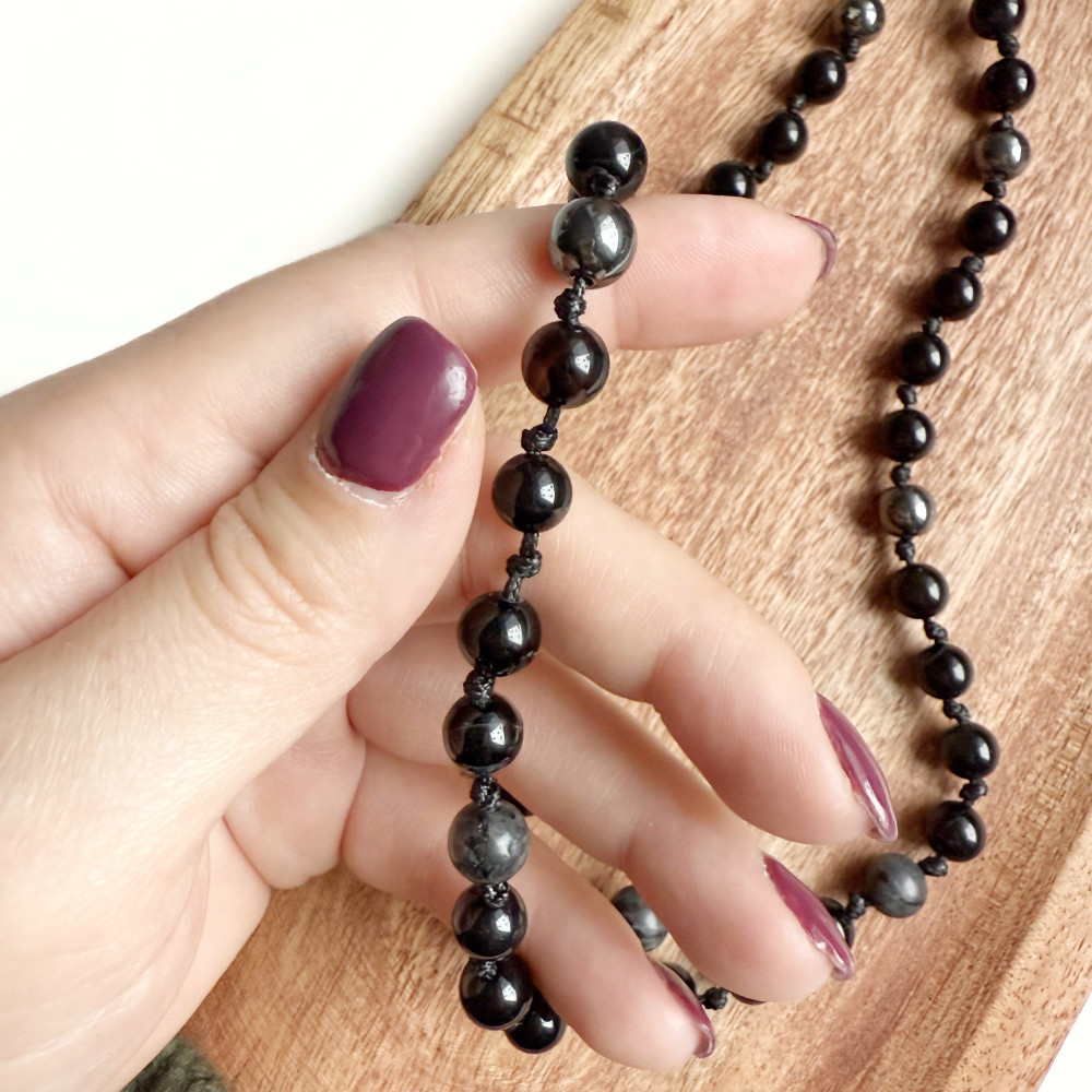 - valódi ónix, hematit és larvikit ásványgyöngyök
