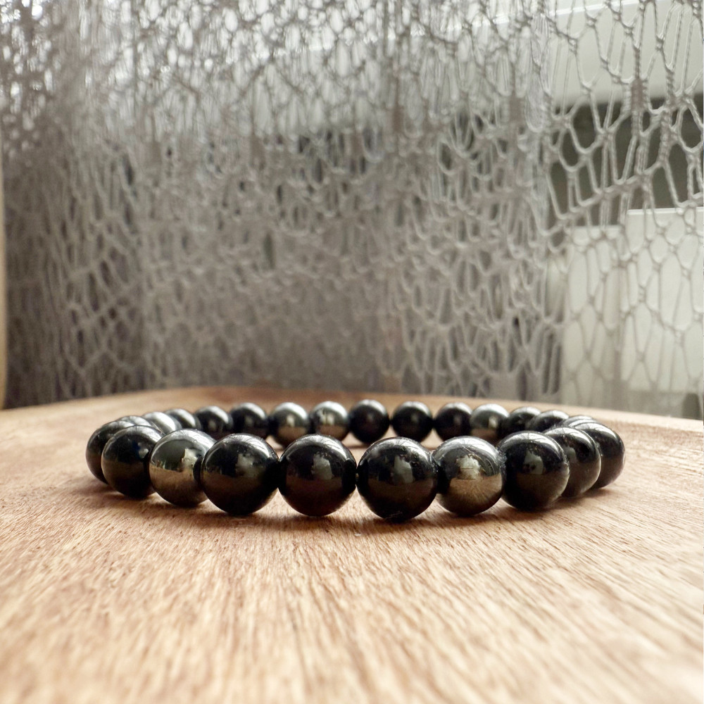 A karkötő ónixból, elszórt hematit szemekkel készül, tiszta, fekete, fémes akcentekkel.