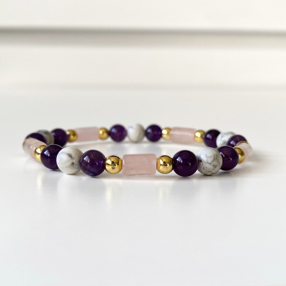 Három ásvány – ametiszt, howlit és rózsakvarc oszlop – finom összhangban jelenik meg benne, a természet lágyságát és a női finomságot megidézve.