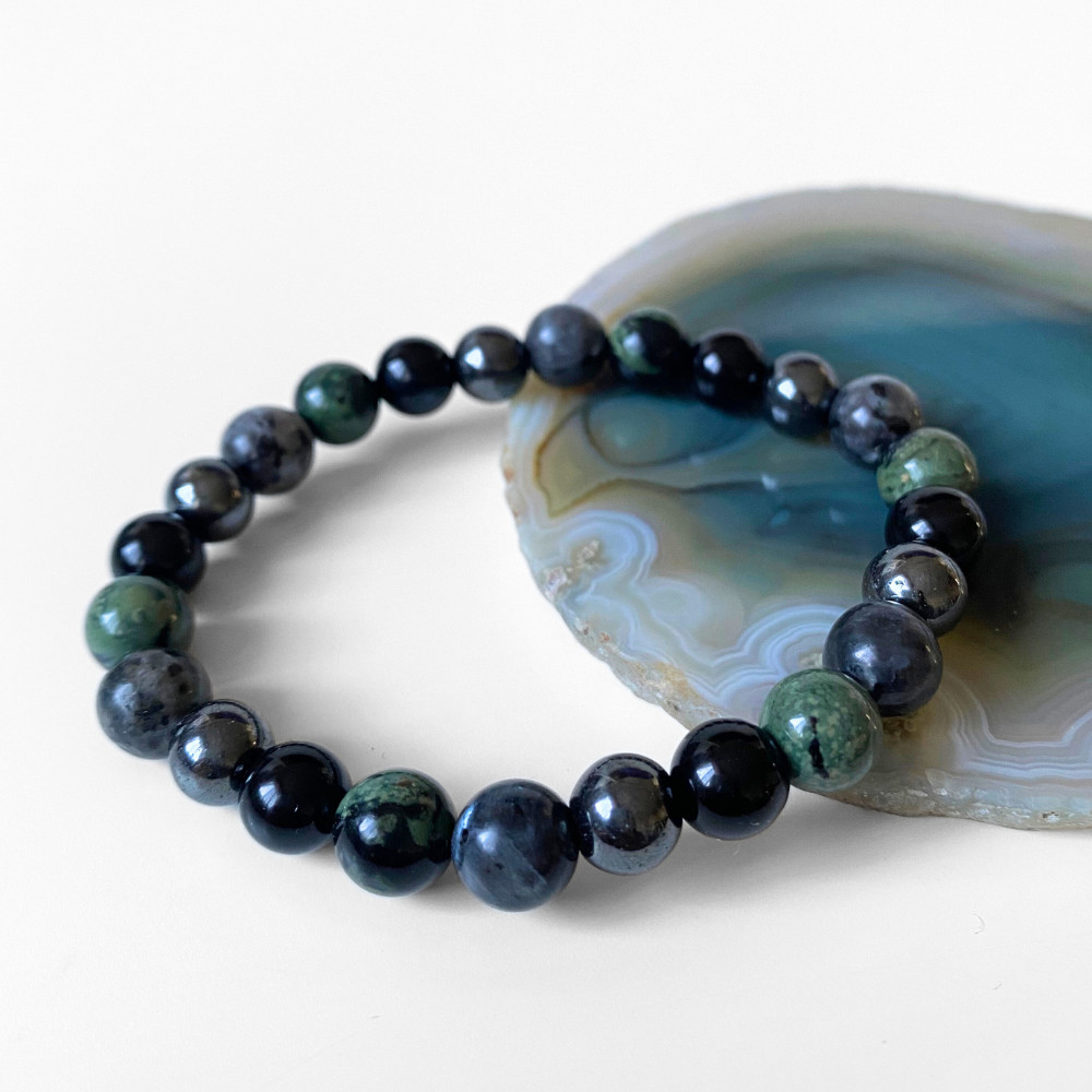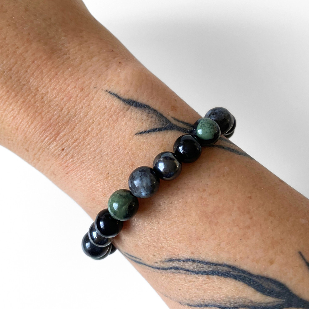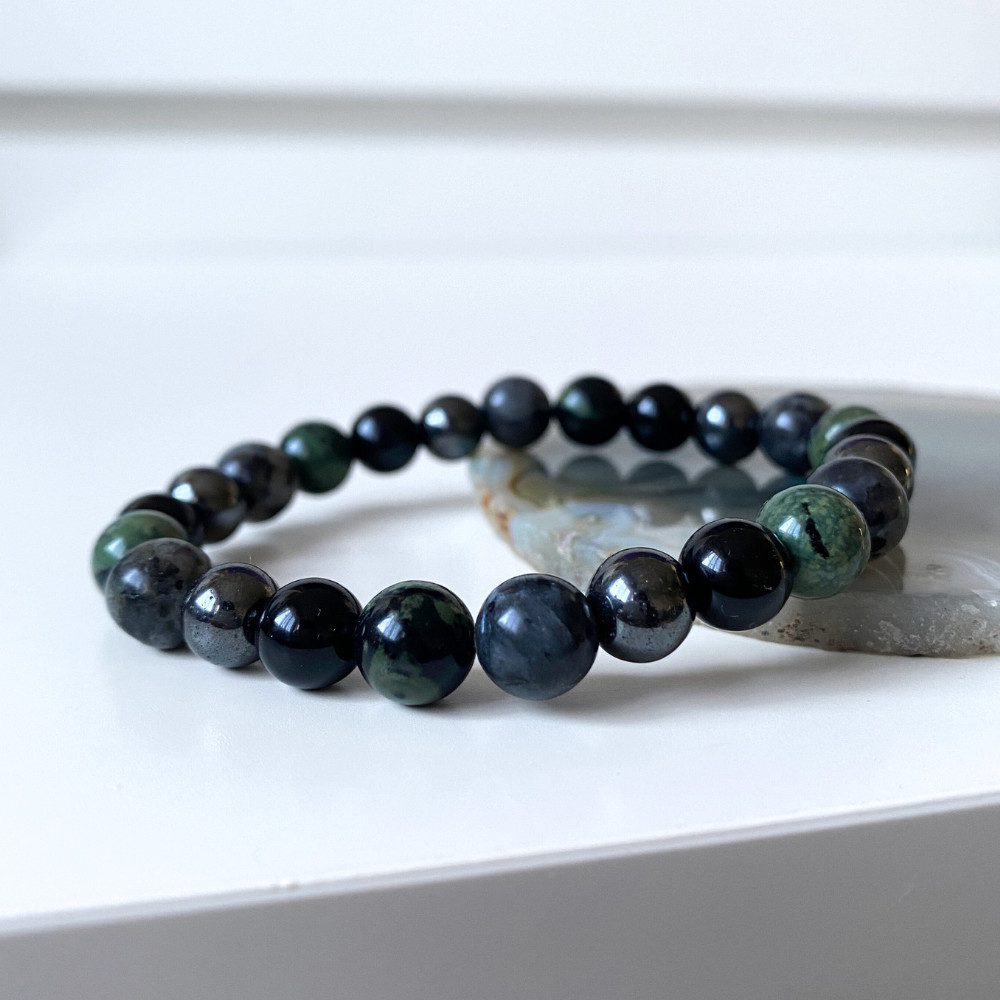 - valódi hematit, jáspis, larvikit és ónix ásványgyöngyökből, kézzel fűzött férfi karkötőt