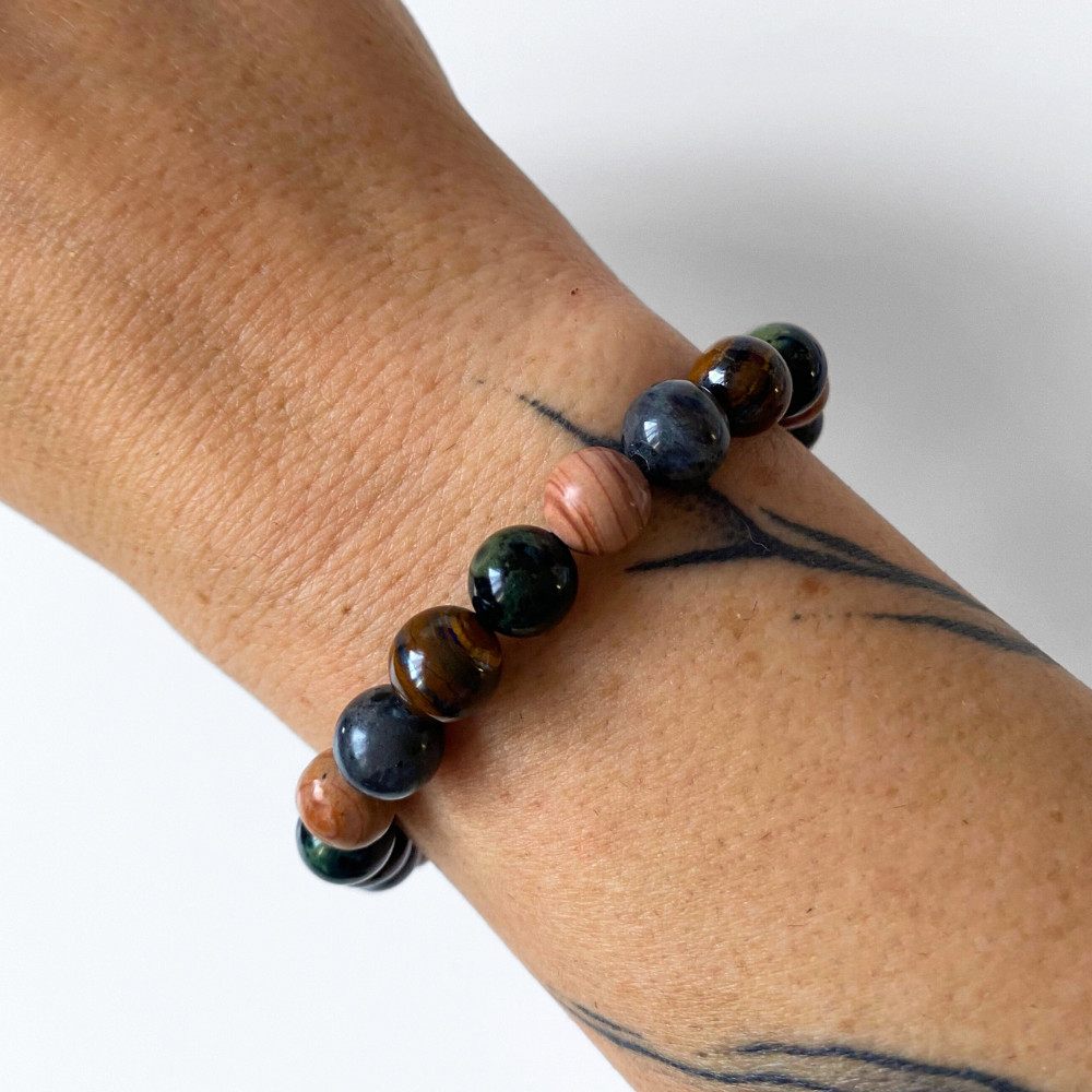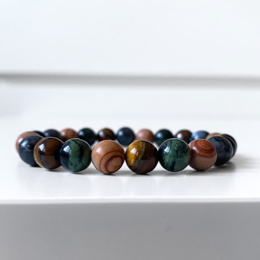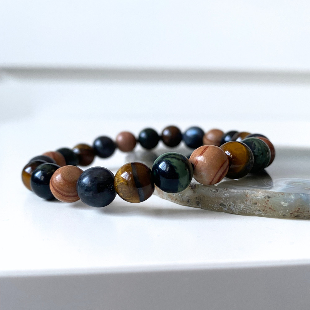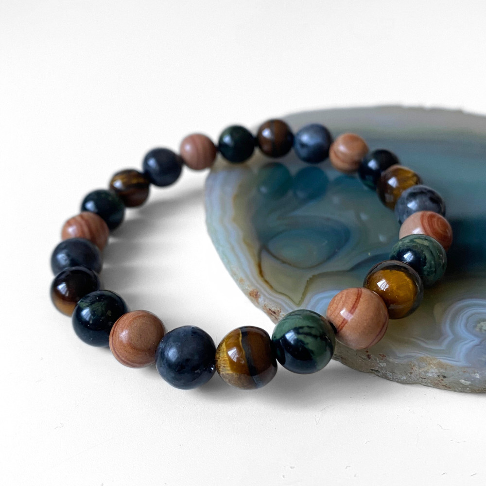 - valódi kambaba jáspis, barna jáspis, larvikit és tigrisszem ásványgyöngyökből fűzött, kézzel készült férfi karkötőt