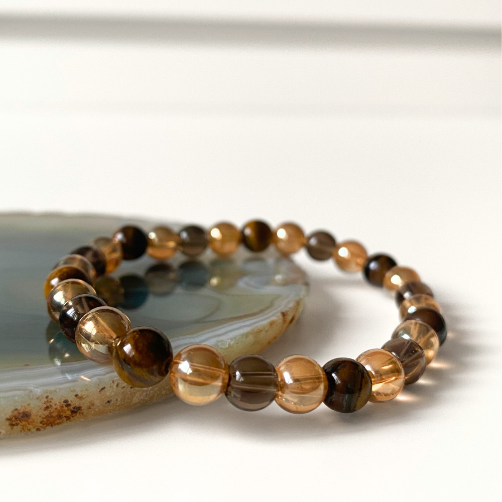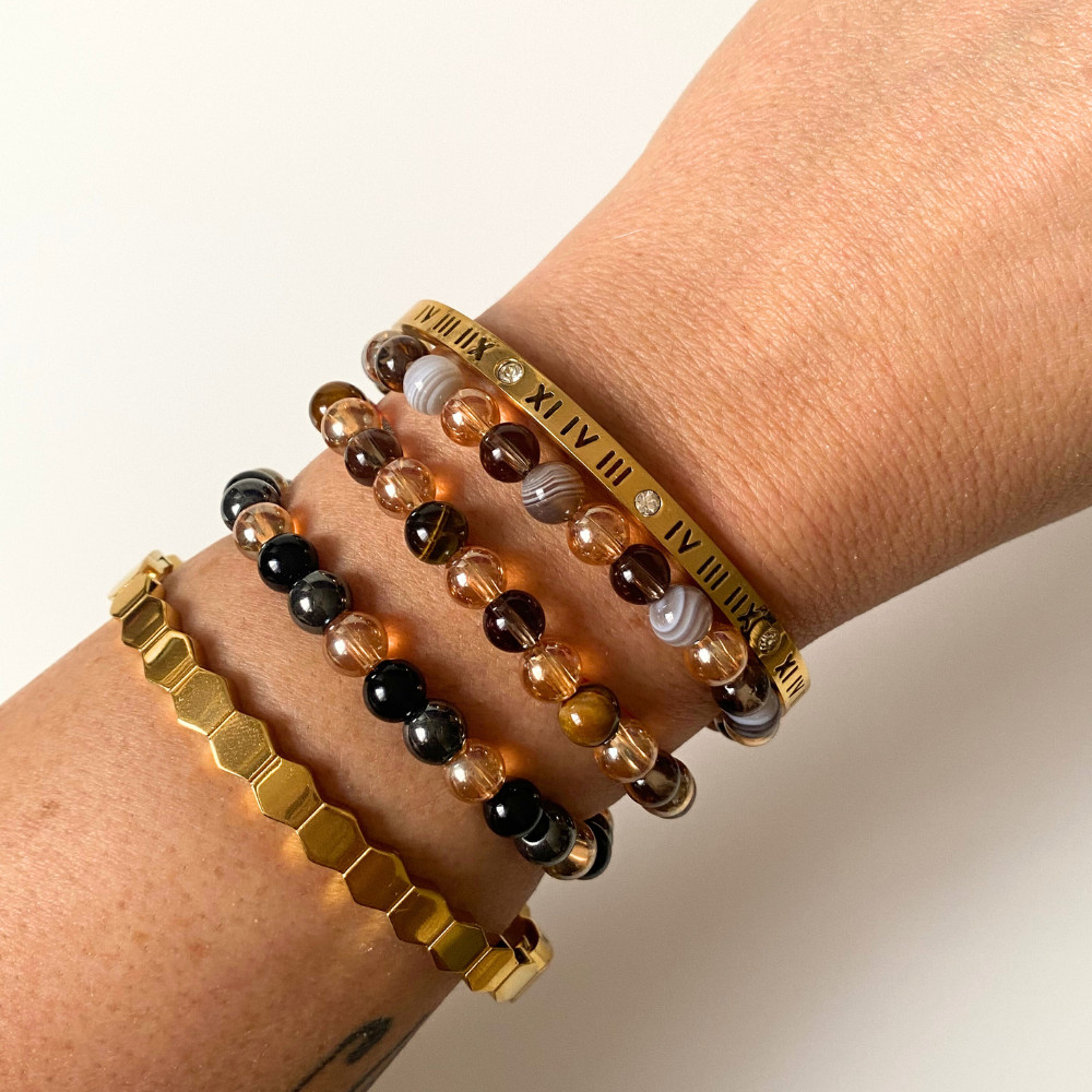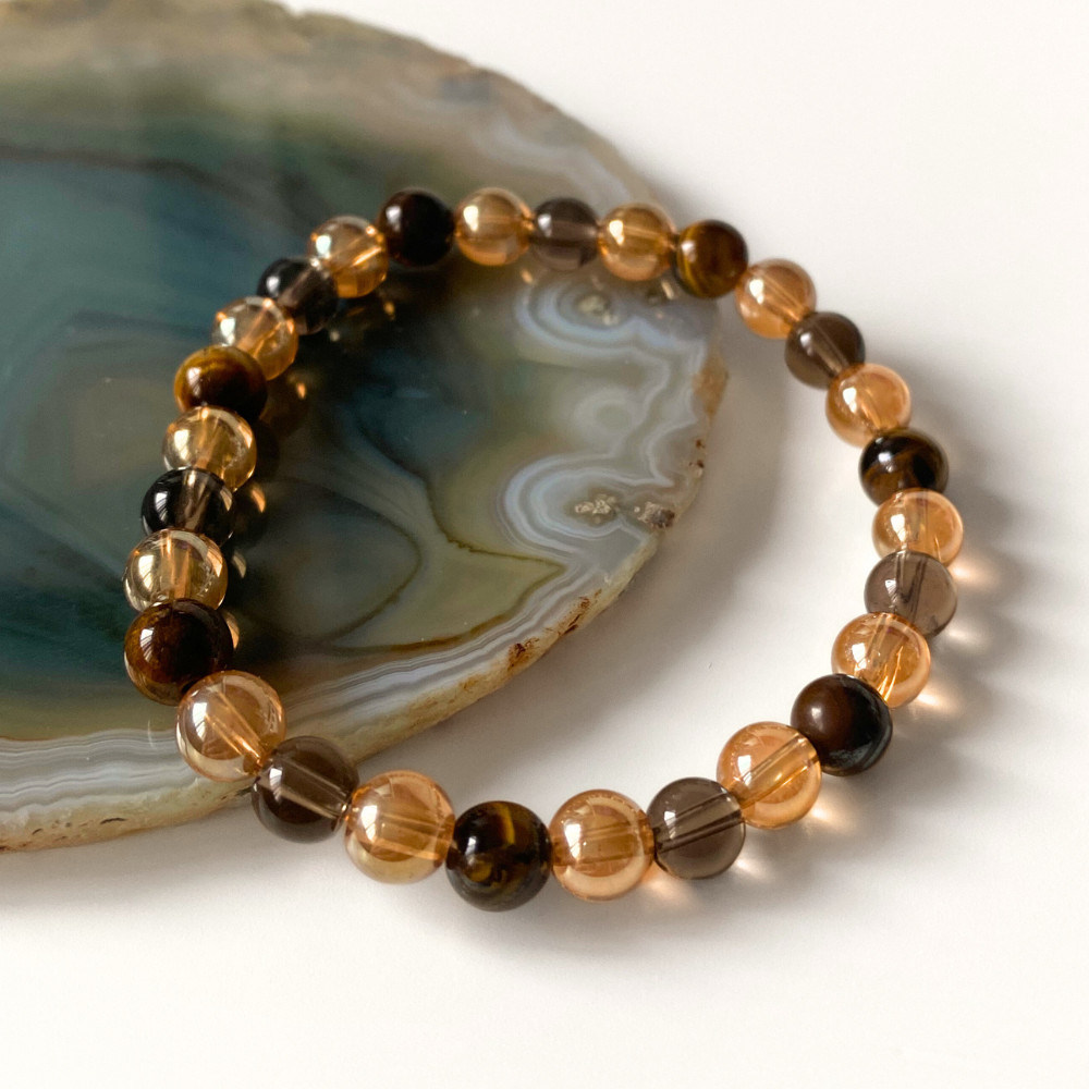 Olyan, mintha a föld meleg színei és a lágy fény találkoznának egy karkötőben, stabil, földelt, mégis életteli.