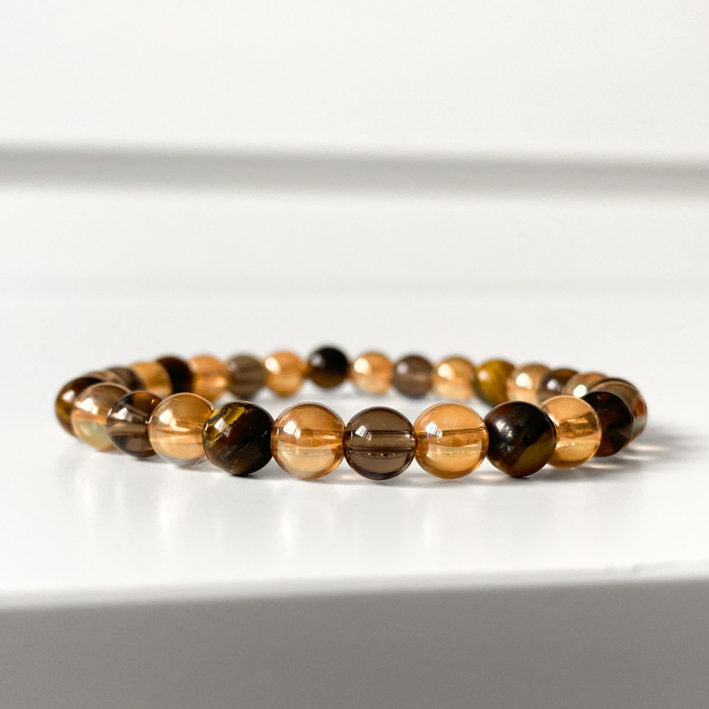 A három ásvány együtt földes, meleg, de nem komor összhatást teremt: a tigrisszem és füstkvarc „megfogja” a karkötőt, az aurakvarc fénye pedig lágyan megvilágítja.