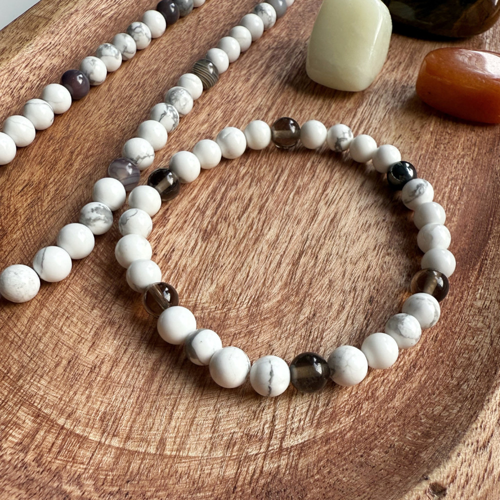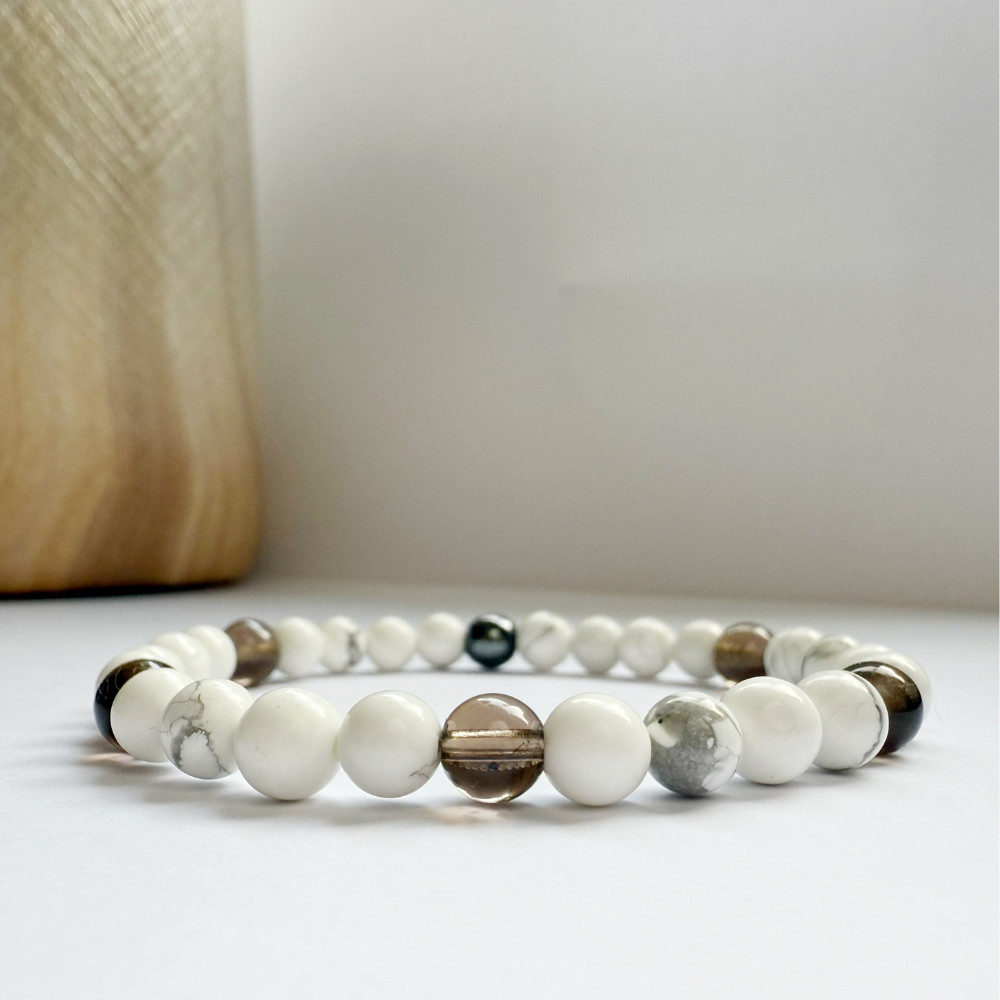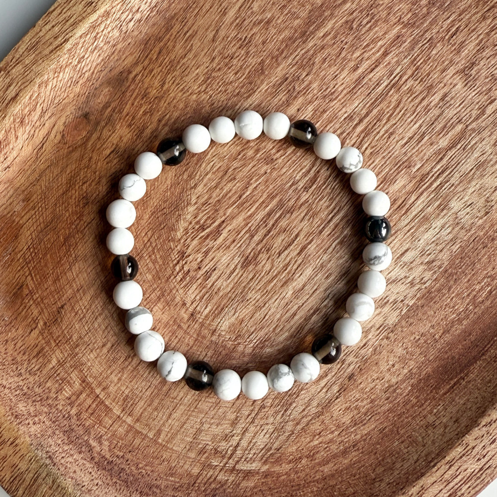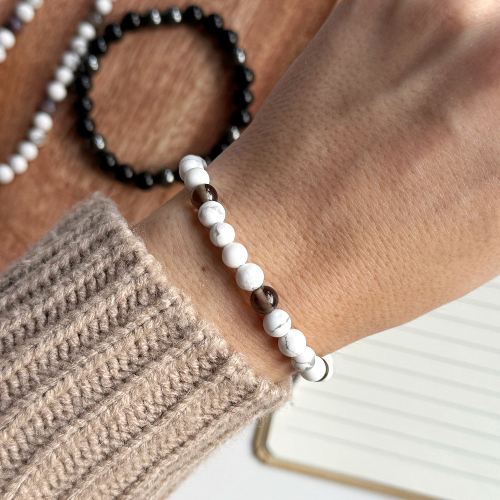 A fehér, szürkés erezett howlit alapját finom, füstös tónusú füstkvarc szemek törik meg, az összhatás letisztult, harmonikus, kicsit “ködös”, olyan, mintha egy puha szürke felhőt hordanál a csuklódon.