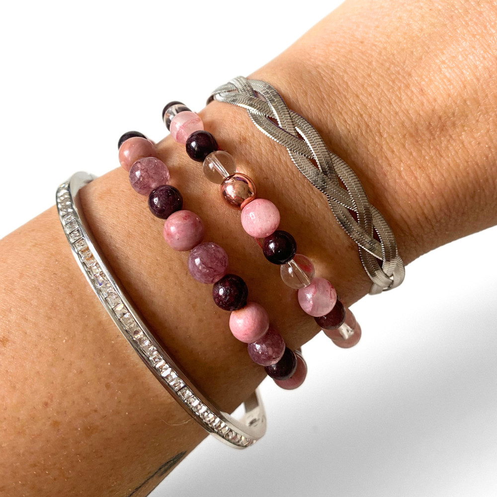 - Más karkötőkkel együtt – vékony ezüst láncos karkötőkkel, vagy akár egy hegyikristályos / kék tónusú ásvány karkötővel kombinálva