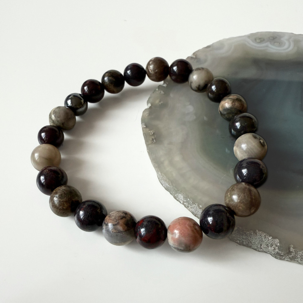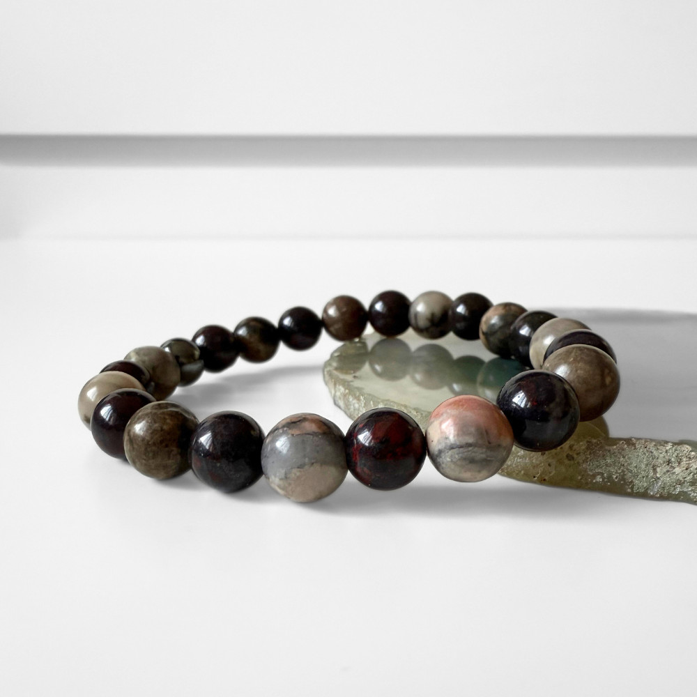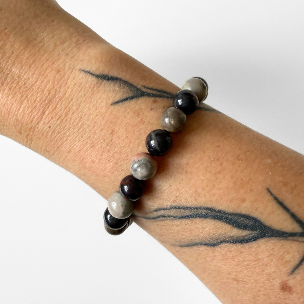 - valódi gránát és szürke rodonit ásványgyöngyökből készült, kézzel fűzött férfi karkötőt