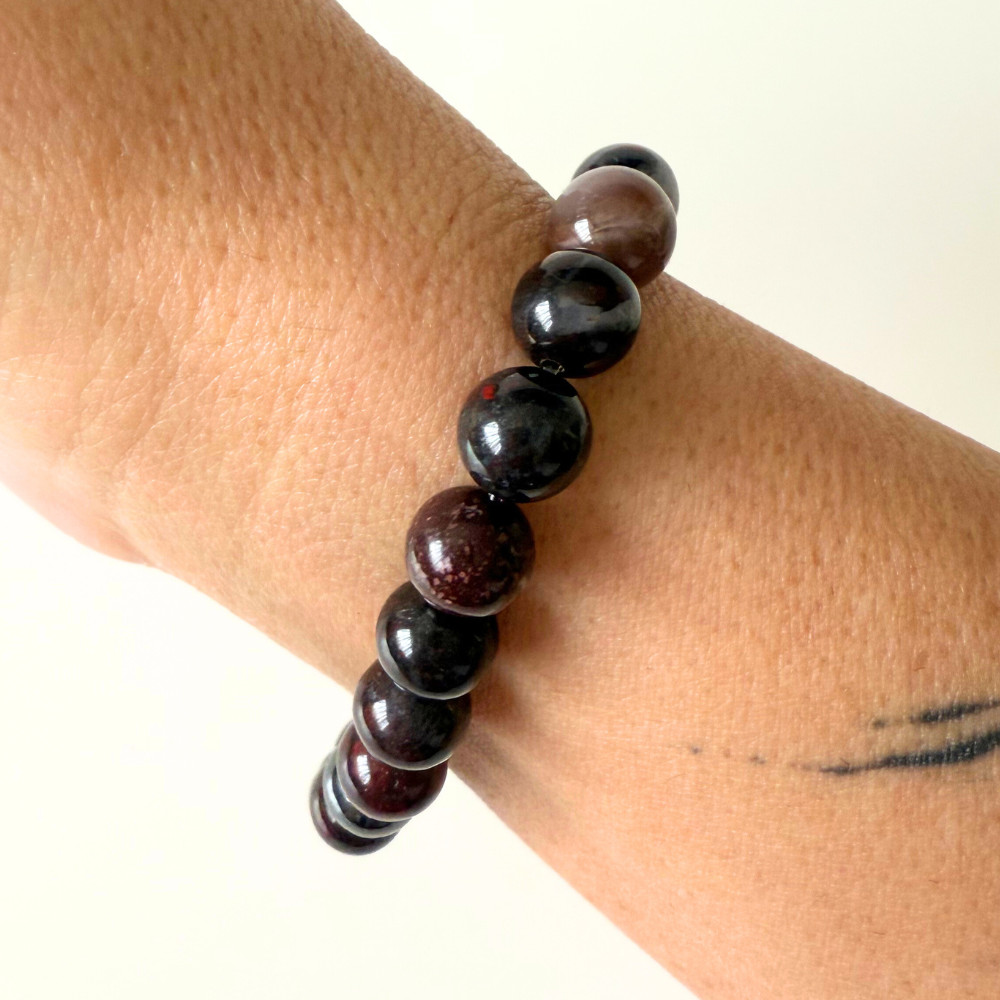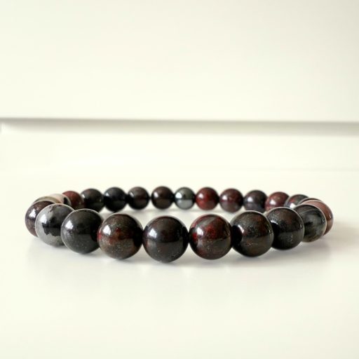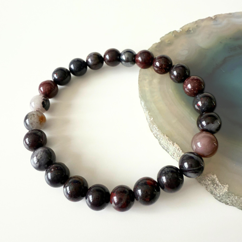 - Breccsa jáspis – jellegzetes, törmelékes, foltos mintázata miatt minden egyes gyöngy más. Vöröses, barnás, földszínű árnyalatai egyszerre idézik a tűz, a kőzetek és a föld erejét. Nyers, masszív, hozza a valódi, természetes kőérzetet.