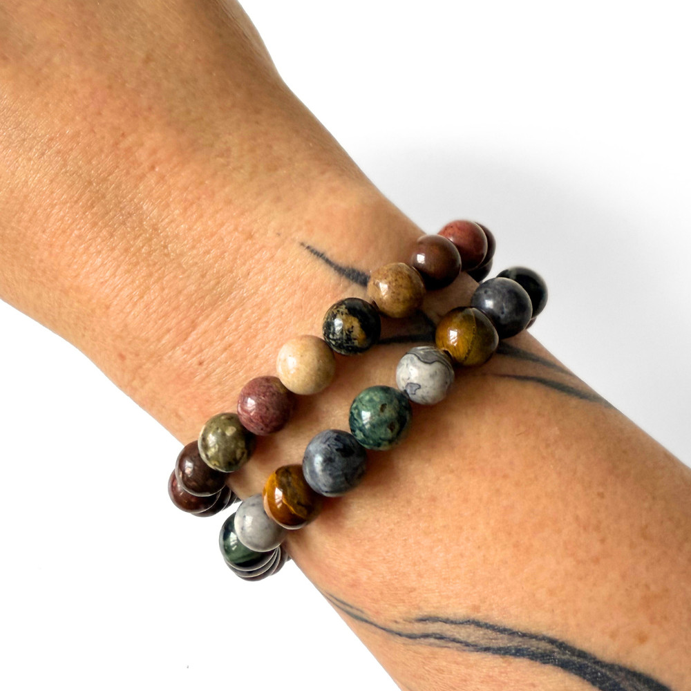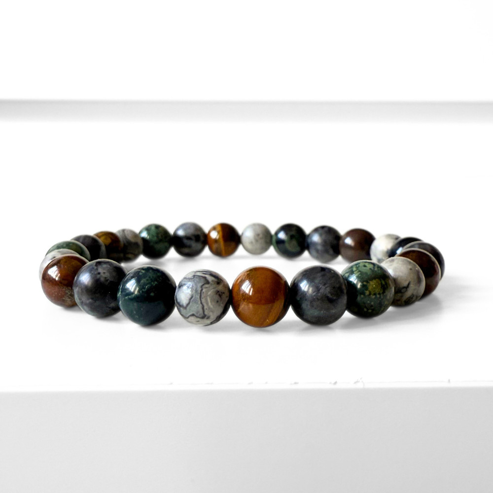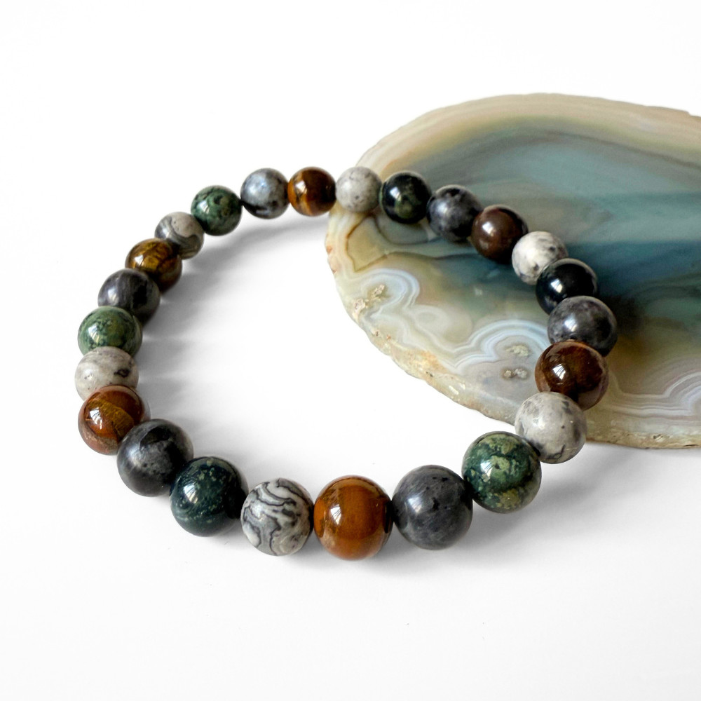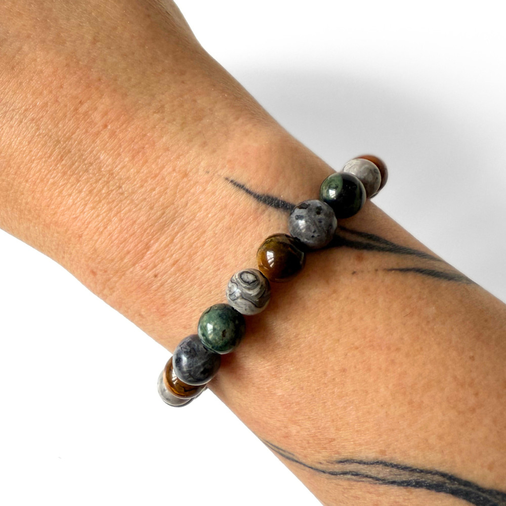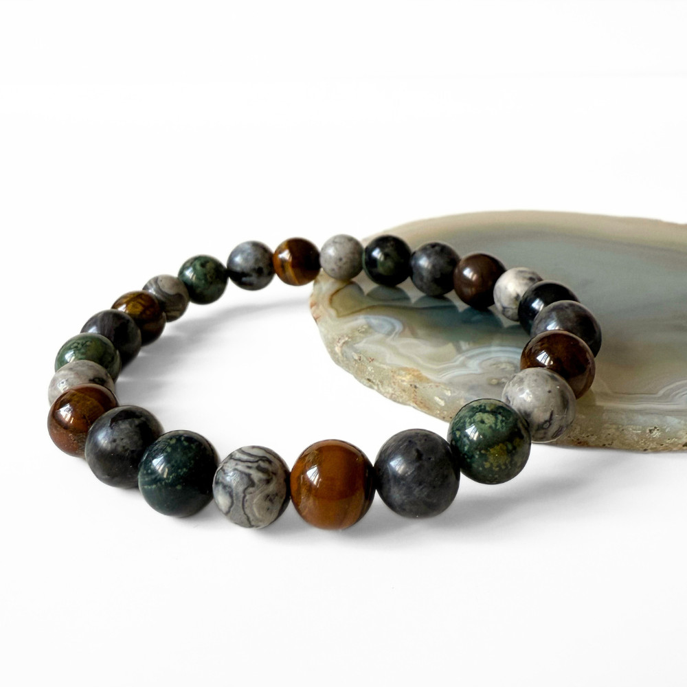 - valódi kambaba jáspis, larvikit, tigrisszem és térkép jáspis ásványgyöngyökből készült, kézzel fűzött férfi karkötőt